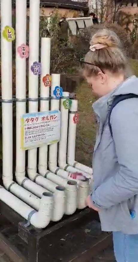 Our next and final stop along the bus route was the Kawaguchiko music forest. Oh, what a wonderful and magical place! Along the banks of the river with a view of Mt Fuji was this wonderful hidden paradise where everything was music themed. Looked a little like Disneyland with European inspired building, beautiful ponds, and even a swan (a real, live, Swan). Everywhere there was a chance to be musical. First, there was a table of hand bells of different kinds, but each with at least an octave to play around with. There were chimes, pipes and bells to keep musical people occupied. Of course, being musical ourselves, Jingle Bells, Do-re-mi, and Twinkle Twinkle Little Star did make an appearance. However, the cool thing about the music forest were the performances. Everyday they hold opera and organ performances for the visitors and we were fortunate enough to catch both! The opera was performed alongside hundreds-year-old automatic organs that only played one song. The two opera singers were a pleasure to listen to, and made for a great performance. The organ performance was even more magical. It was a complete organ that took up half the building, I think a picture is the only way I can describe it. The organ has a total of 800 pipes, is 13 meters wide and 5 meters high. All 40 of the characters moved with their fully functioning instruments. There were drums, horns and its basically the biggest and most elaborate music box I have ever seen. INSANE!