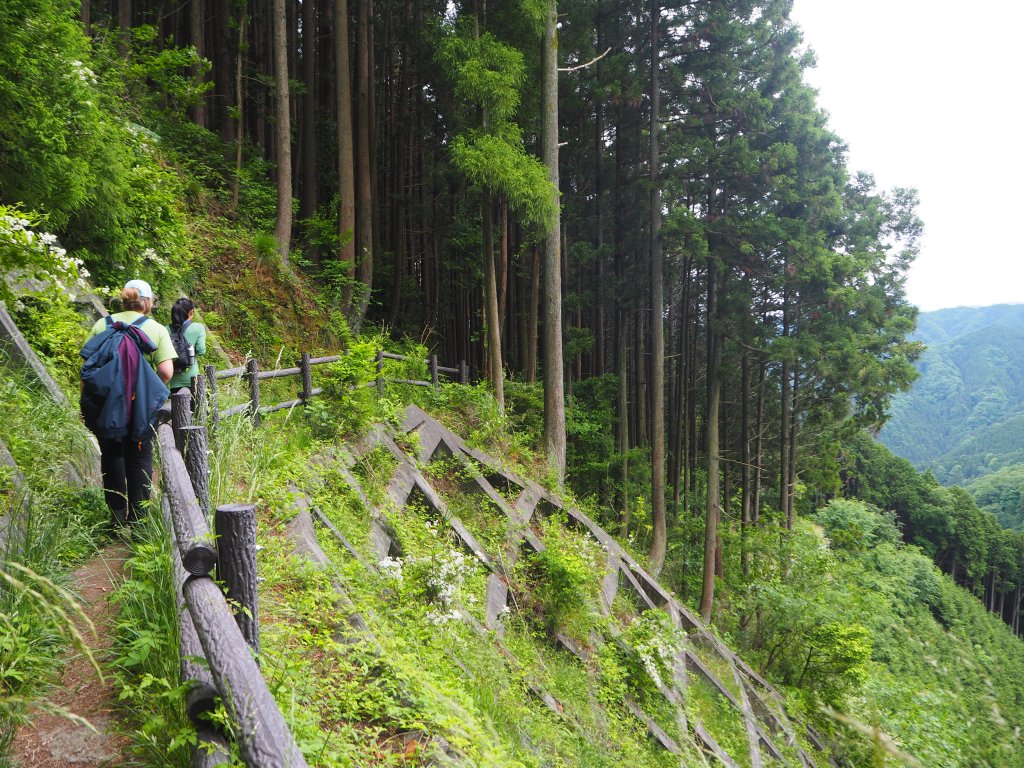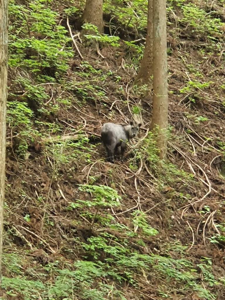 After admiring the breathtaking views, we (Maddy) deciphered the signs to the train station and we began our descent. The descending trail is significantly quieter than the ever-popular Mt. Mitake, and is a lot more rugged. Due to the quiet nature of the trail, we happened upon a few delightful surprises on our way down. The first was nearly running into a mountain biker who was riding UP the mountain, over incredibly knotted root systems, on a VERY slim path. He must be a very experienced cyclist to be able to tackle that trail! Our second surprise was spotting a rare, Japanese animal called a ‘serow.’ Maddy was hiking up front and stopped suddenly, pointing up on the hillside. We all gasped when we found the serow with our eyes. The serow is a Japanese mountain goat that is considered to be a cross between a goat and an antelope. An avid hiking colleague of mine has told me that he’s never seen one in the wild while hiking and that it’s quite rare, so we feel incredibly fortunate to have seen one. It just goes to show that it’s worth going off the beaten track a little.