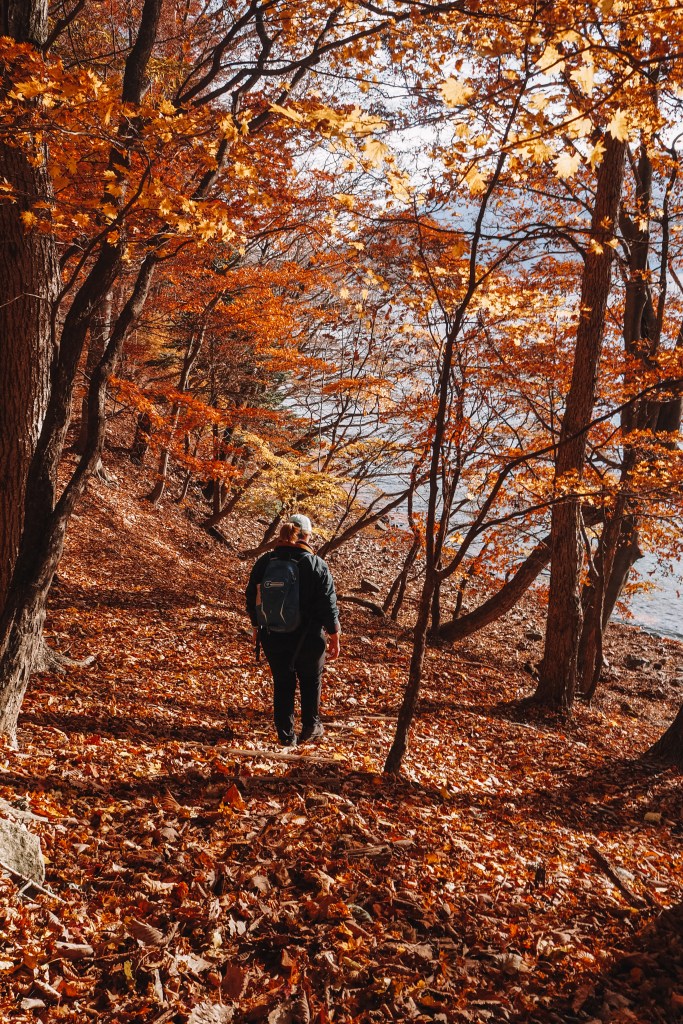 A surprise for us was that we only came across 2 other people on the trail. However, the joy of being the only people on the trail for miles was that we could enjoy the spectacular scenery all to ourselves. The fallen leaves were like a blanket on the ground and we occasionally passed through sections of evergreen trees where the environment was very different. Along the entire route the lake kept us company with some spectacular viewpoint stop offs to admire the never-ending lake.