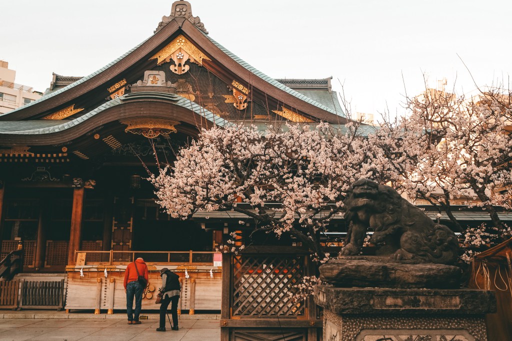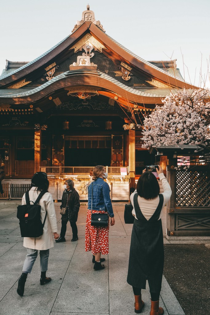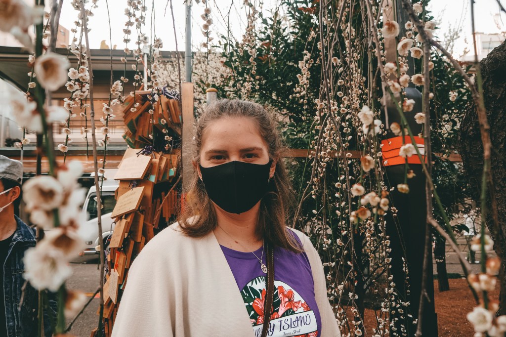 The weekend we visited was forecast for two 20-degree days so we decided to head out to one of the well-known plum blossom spots in Tokyo to catch them at their peak. While there are a few famous plum blossom groves in Tokyo, we went to Yushima Tenjin Shrine which is home to hundreds of plum blossoms. The shrine has so many plum blossoms because the man enshrined there wrote his very first haiku poem about plum blossoms. There were quite a few people admiring and taking photos of the beautiful flowers and there was even a news crew! (We were later told by Maddy’s colleague that we had accidentally made it into the back of one of the news shots that was aired on TV!)