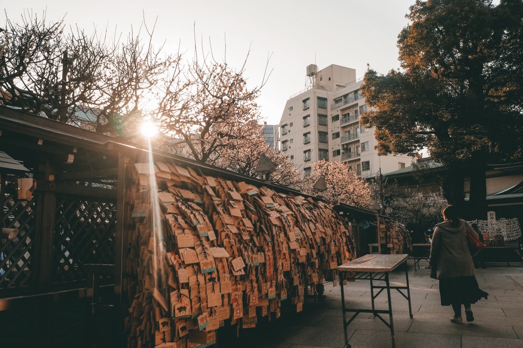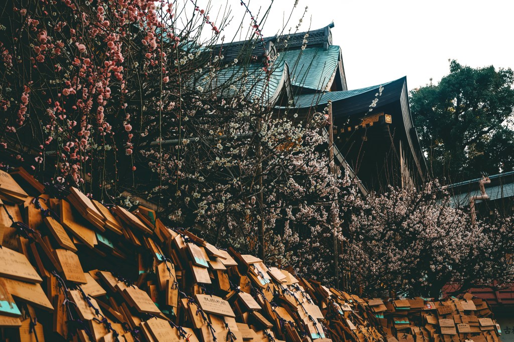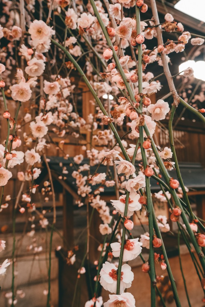 Yushima Tenjin is a ‘scholar’s shrine’ and many students go there to pray for good exam results. The shrine was surrounded by thousands of ema (wooden tablets) with prayers on them for good results on university entrance exams. They also have all kinds of plum blossoms and colours, from white to pink, to red, and the weeping plum blossoms that are our personal favourites.