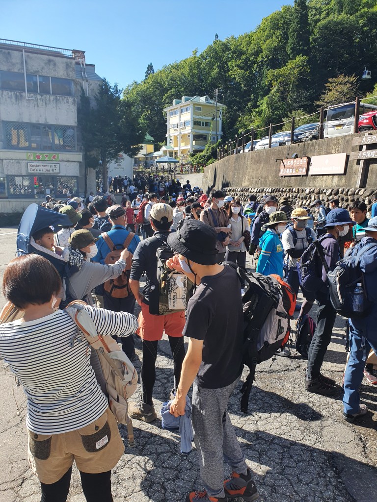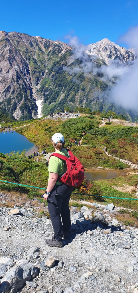 The next morning, we started with an amazing brekky provided by the lodge at 7:30am, then headed out to our first stop of the day: hiking to Happo-ike (Happo pond). We were aware this hike was probably fairly popular but we had no idea how popular. The town of Hakuba itself seemed pretty dead but when we arrived at the bottom of Happo-one, it was an entirely different story. To start the hike to Happo-ike, one must take a gondola and 2 chair-lifts up past the famous and very popular Happo-One slopes. The line to get on the gondola was incredibly long and snaked round several times. Parking was also challenging and cost $10, mostly because we were there at 9am. So, if you’re going to do the Happo-ike hike, we suggest getting there when the lifts open at 7am! It took us about 45mins to get onto a gondola which was okay, as standing in a ski village looking up at the mountains is not a bad place to wait. A gondola trip and 2 chair lifts later, we arrived at the starting point. The view of course from the chair lifts was INCREDIBLE and well worth the money to get on.