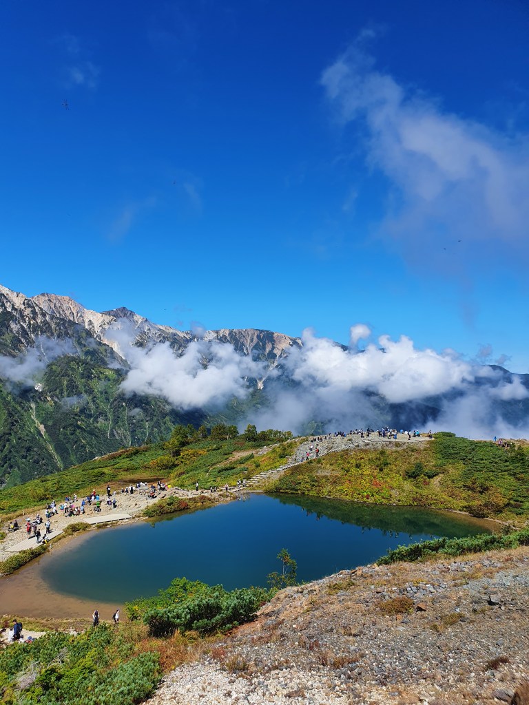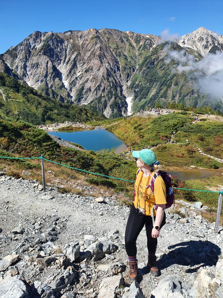 Fortunately, the wait for the gondola separated people enough that the start of the hike was relatively quiet. It starts with a rock and dirt path that snakes up the mountain side, followed by a boardwalk path that takes you through a pass to the ridgeline. Here it started to get a little busier as people stopped to have snacks, check out the view, or just have a rest. By the time we hit the ridgeline, it was hiker to hiker, masks on for everyone (well…most people). Again, we would suggest going a lot earlier! This part of the hike gets relatively steep and is mainly rock all the way up to the pond. But don’t fear, at every corner the path widens which allows plenty of room to take a quick rest and check out the amazing view which gets better and better as you climb! Eventually, you will reach Happo-ike. The pond itself is…fine? It’s a pond, not particularly large but, it’s not just the pond that makes this spot amazing. It’s the pond surrounded by Alps that makes this place amazing. The pond reflects its surroundings and makes for a photographer’s dream spot. Of course, the area around the pond was extremely busy as a lot of people chose this spot to stop and have lunch. We opted to sit down by the pond for a few minutes before climbing to the top side to get a better view, and some photos. As you can see, the hike was SO worth it. Sometimes the brain just can’t comprehend what it’s looking at, and this was one of those times. It was like staring at a postcard. The mountain-top pond reflecting the giant white-topped alps in the background makes you feel pretty small. The site was beyond incredible to see. It’s hard to explain and the photos don’t even do it justice.